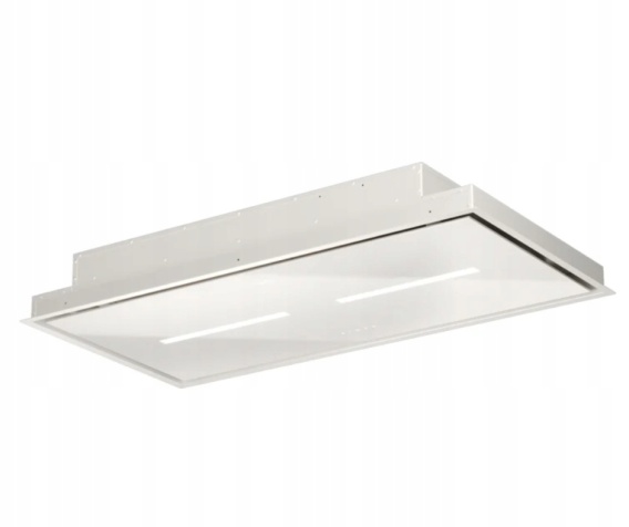 Okap nadaje się do całkowitej zabudowy. Zabudowuje się go bezpośrednio w sufit co czyni, że widocznym pozostaje jedynie dolny panel (od spodu).